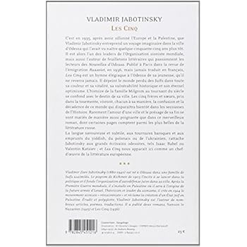 C'est en 1935, après avoir sillonné l'Europe et la Palestine, que Vladimir Jabotinsky entreprend un voyage imaginaire dans la ville d'Odessa qui l'avait vu naître quelque cinquante-cinq ans plus tôt. Il est alors l'un des leaders de l'Organisation sioniste mondiale, mais aussi l'auteur de feuilletons littéraires qui passionnent les lecteurs des Nouvelles d'Odessa. Publié à Paris dans la revue de l'émigration Rassviet, en 1936, mais jamais traduit en français, Les Cinq est un hymne élégiaque à l'Odessa de sa jeunesse, qu'il ne reverra jamais. Il dépeint le monde perdu des juifs dans toute sa couleur et sa vitalité, sa vulnérabilité historique et son éternel optimisme. L'histoire de la famille Milgrom au tournant du siècle se confond avec le destin de sa ville. Les cinq frères et sœurs, pris dans la tourmente, vivront, chacun à sa manière, la confusion et la décadence de ce monde qui disparaîtra bientôt dans les secousses de l'Histoire. Rarement l'amour d'une ville et le présage de sa fin se sont mariés de manière aussi poignante que dans ce merveilleux roman, dont certaines pages comptent parmi les plus belles de la littérature russe. La langue savoureuse et subtile, aux tournures baroques et aux emprunts du yiddish, du polonais ou de l'ukrainien, rattache Jabotinsky aux grands écrivains odessites, tels Isaac Babel ou Valentin Kataïev ; et Les Cinq nous apparaît ici comme un chef d'œuvre de la littérature européenne.