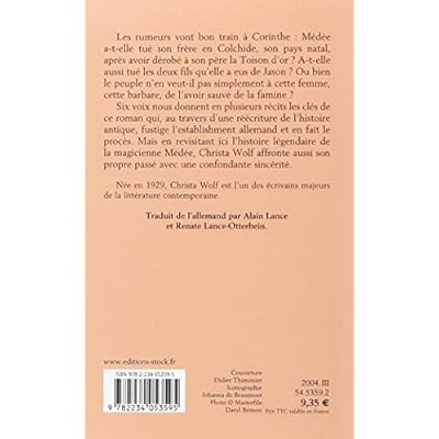 Une belle interprétation du mythe de Médée : même si au final on préfère peut-être la version dite officielle de Médée (plus proche de la violence et de la cruauté des mythes grecs), Christa Wolf nous présente une Médée humaine. Ce roman polyphonique nous amène les différents pensées (classées par chapitre) de plusieurs personnages pour nous faire comprendre que nous avons une vision faussée de Médée.Si Christa Wolf exploite des failles du mythe -comme le rejet de la faute du meurtre des enfants sur Jason, la tradition des peaux de mouton qui recueillaient l'or en Colchide par exemple-, ce n'est pas que pour servir le mythe. C'est aussi une réflexion sur soi et sur la RDA.Je n'ai eu accès qu'à la version française du texte, cependant j'ai pu remarquer quelques fautes d'accord, d'expression et de syntaxe. Néanmoins, ce livre est à lire.